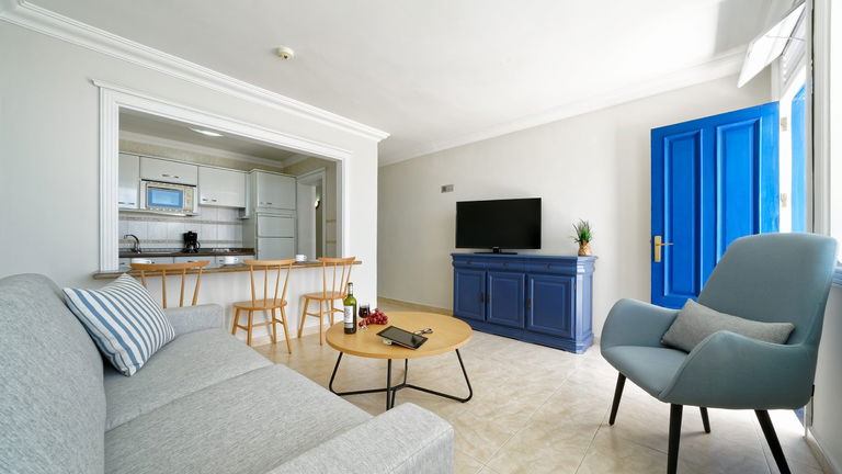 The One Bedroom Apartments feature a private balcony or terrace, bathroom with shower and hair dryer, and come equipped with fridge, tea and coffee making facilities, LCD TV (national and international satellite), air conditioning and safety deposit box. A well equipped kitchenette and living room with a sofa make each apartment the ideal accommodation for a memorable self-catering vacation.
